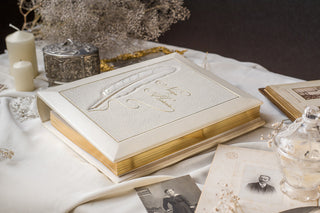 Nasze księgi oprawione zostały we włoską skórę w dwóch wariantach - klasycznym brązowym oraz w delikatnym kremowo-białym kolorze.